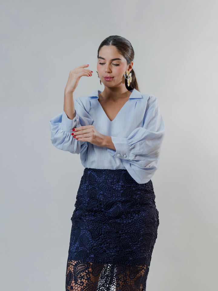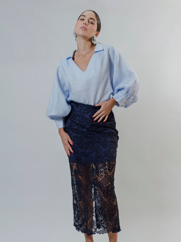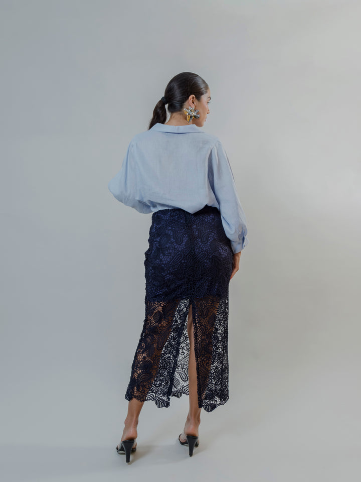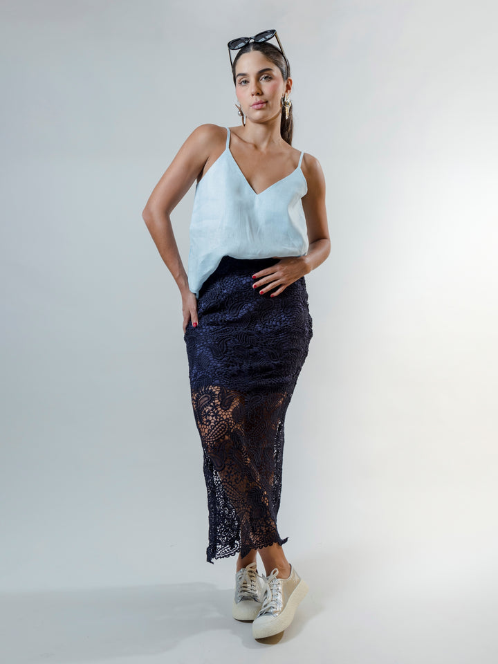 Una pieza que redefine la feminidad con elegancia. Esta falda midi de cintura alta combina estructura y suavidad en un delicado tejido de encaje. Su corte recto estiliza la silueta, mientras que el sutil contraste entre el forro superior y la transparencia inferior añade un toque de sofisticación y modernidad.