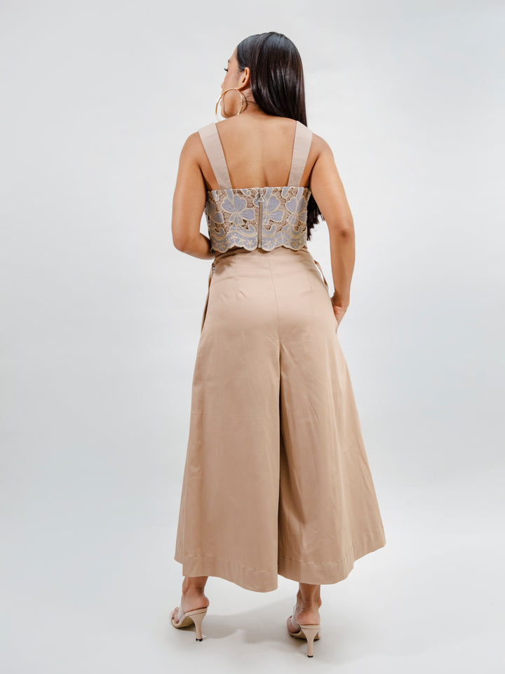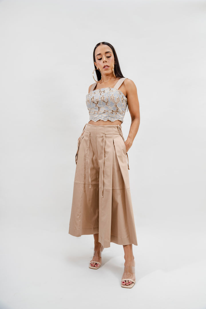 Su silueta tipo palazzo amplio con pliegues frontales aporta sofisticación y caída fluida, mientras que los bolsillos laterales lo hacen práctico y versátil. Perfecto para combinar con crop tops, blusas o camisas, creando desde un look casual chic hasta una propuesta más formal.