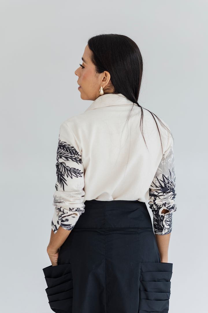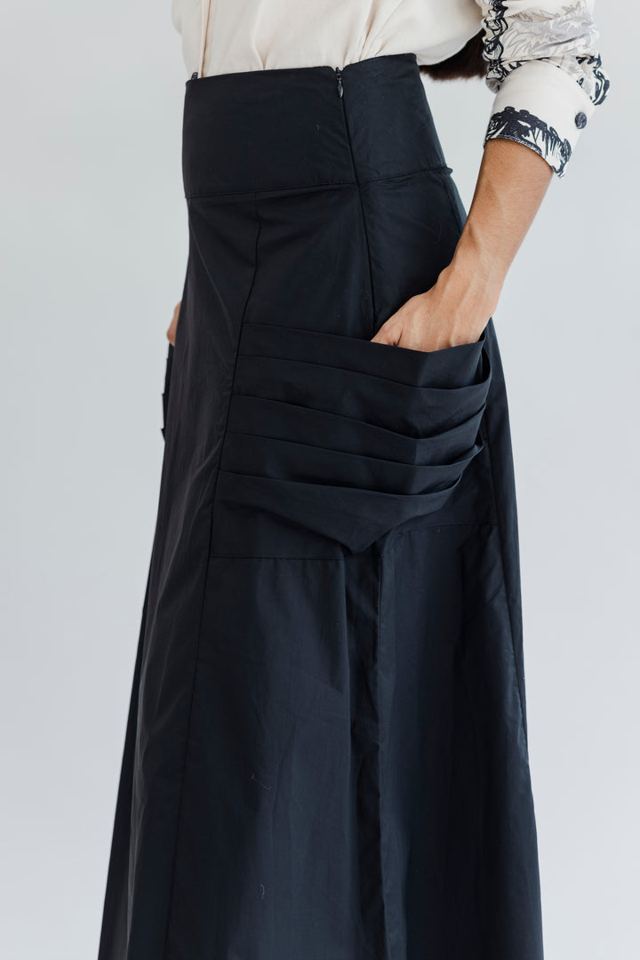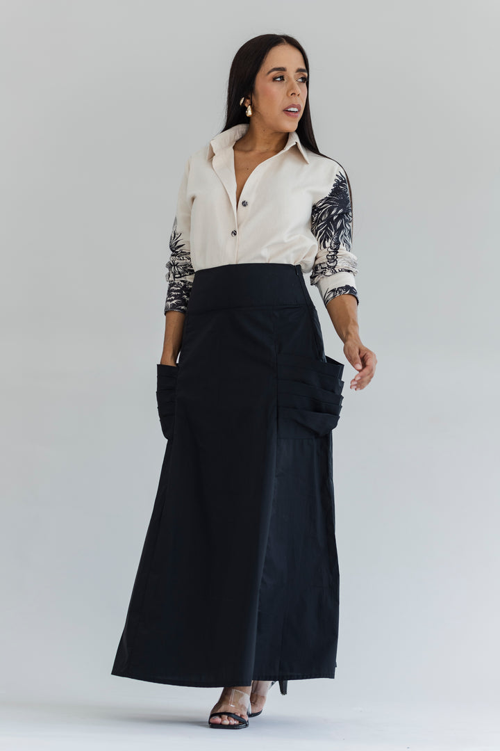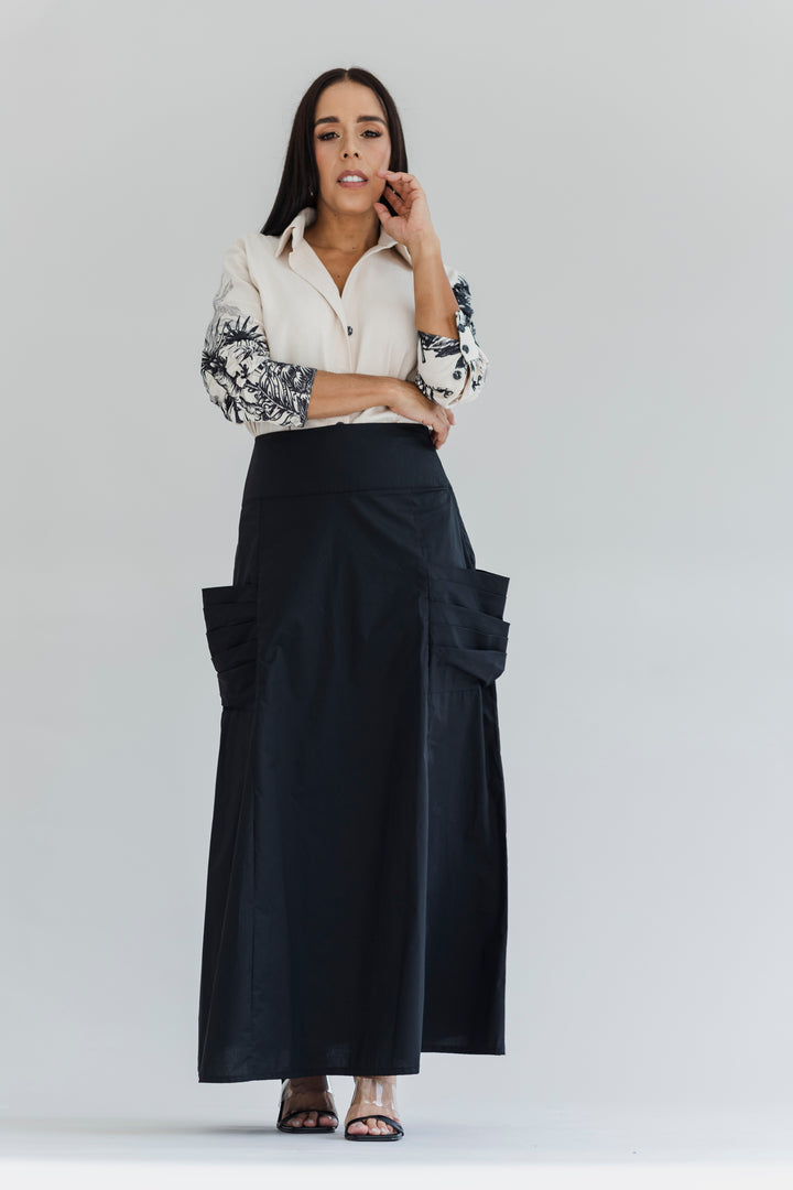 Falda midi de corte amplio, confeccionada en 100% algodón, que proporciona frescura y comodidad. Destaca por su cintura alta que estiliza la figura y sus bolsillos laterales con detalle fruncido, que aportan un toque moderno y funcional. Es una prenda versátil y elegante, ideal para crear looks sofisticados en cualquier temporada. Disponible en tonos neutros que facilitan su combinación con distintas texturas y colores.