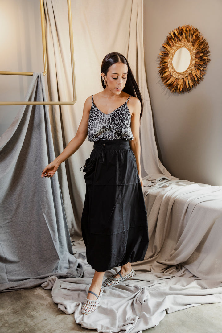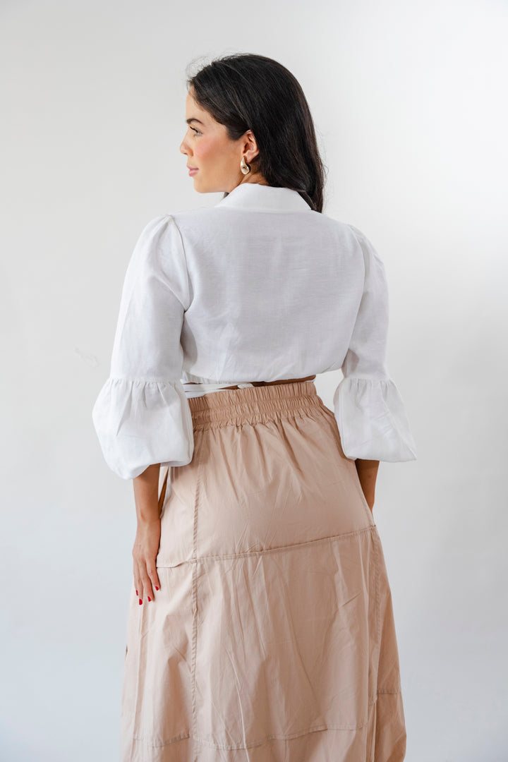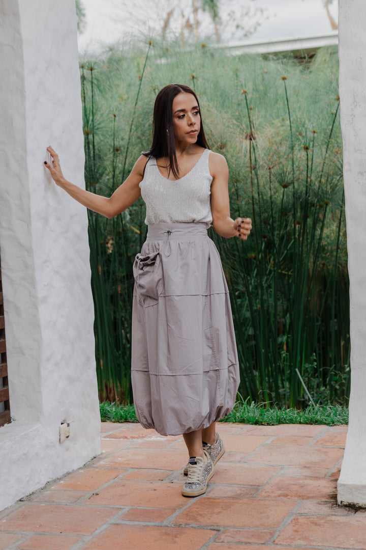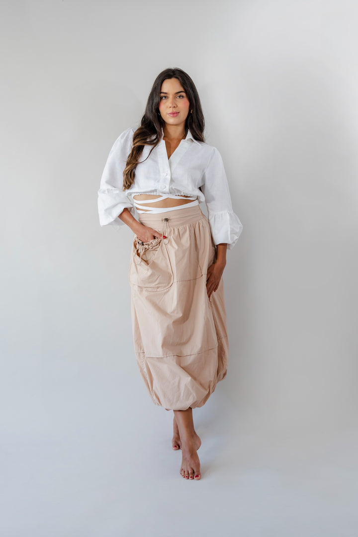 Esta falda de largo midi, confeccionada en 100% algodón, combina estilo y funcionalidad con un diseño moderno y versátil. Su silueta abullonada aporta un toque sofisticado y relajado, ideal para cualquier ocasión. Perfecta para lucir con un crop top o una camisa estructurada, esta falda es una pieza clave para un look fresco y elegante.