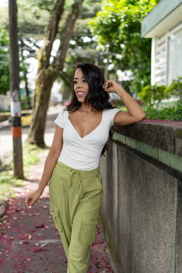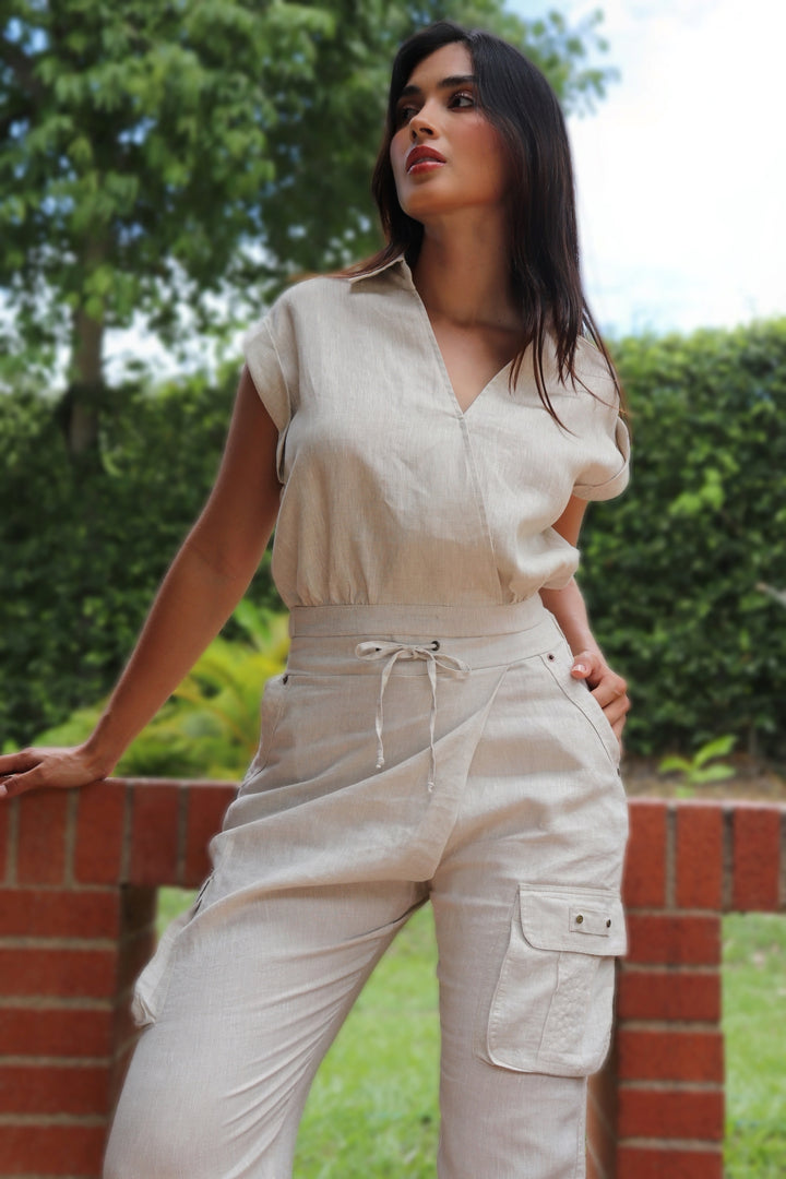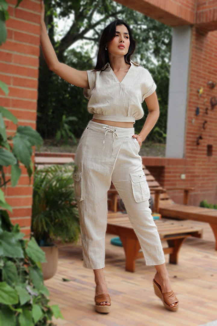 Pantalón en 100% lino natural, ligero y altamente fresco. Su diseño tipo cargo incorpora bolsillos laterales amplios y funcionales que aportan un estilo moderno y utilitario. La pretina con cordón ajustable permite adaptar el fit a la silueta, mientras su corte recto y tobillo ligeramente elevado brindan una caída relajada y versátil. Perfecto para looks casuales con un toque sofisticado.