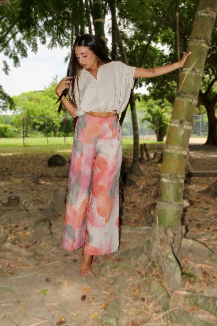 Pantalón de lino con un diseño amplio y fluido, ideal para un look fresco y sofisticado. Su estampado en tonos suaves y difuminados le da un aire artístico y elegante, perfecto para la temporada. La tela de lino permite una caída ligera y natural, brindando comodidad y estilo a la vez. Es una prenda versátil que se puede combinar fácilmente con blusas o tops en tonos neutros para un equilibrio armonioso.