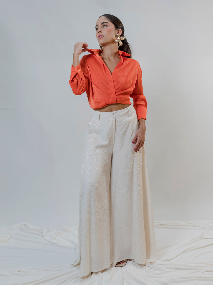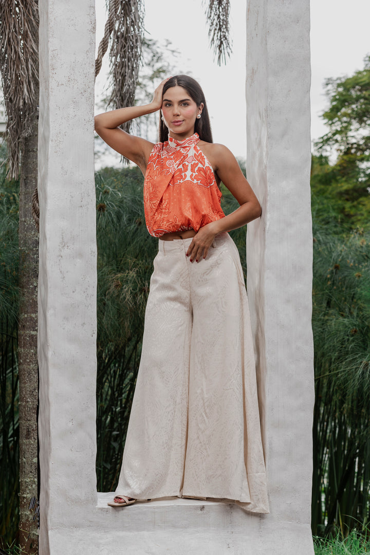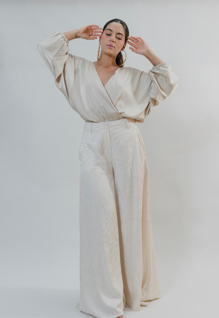 Eleva tu elegancia con nuestro pantalón palazzo en tono vainilla, confeccionado en 100% rayón viscosa. Su caída fluida y textura sutilmente jacquard le otorgan un movimiento sofisticado y delicado, perfecto para ocasiones especiales o para destacar en un look de día. De tiro alto y corte amplio, estiliza la silueta y su forro garantiza total comodidad.