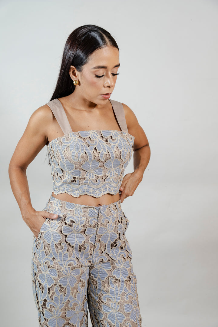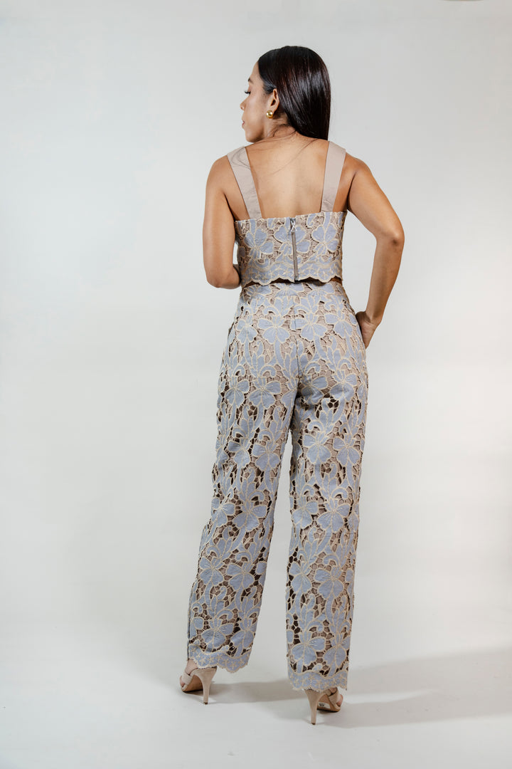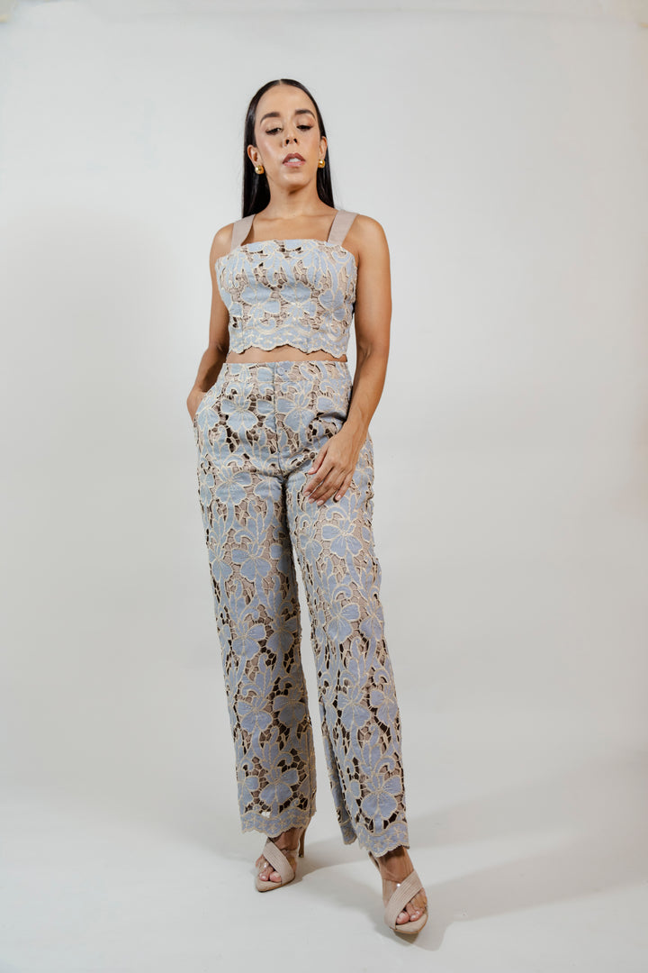 Pantalón de silueta recta elaborado en encaje floral 50% algodón y 50% poliéster, con fondo en tono nude que resalta los bordados en azul y beige. Su diseño estructurado incluye pretina con cierre frontal y bolsillos laterales funcionales. El acabado festoneado en el ruedo añade un detalle delicado y artesanal. Ideal para lucir en conjunto con el top a juego o combinarlo con prendas neutras para un look elegante y contemporáneo.