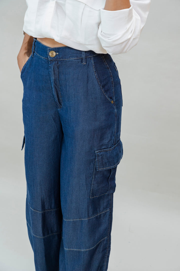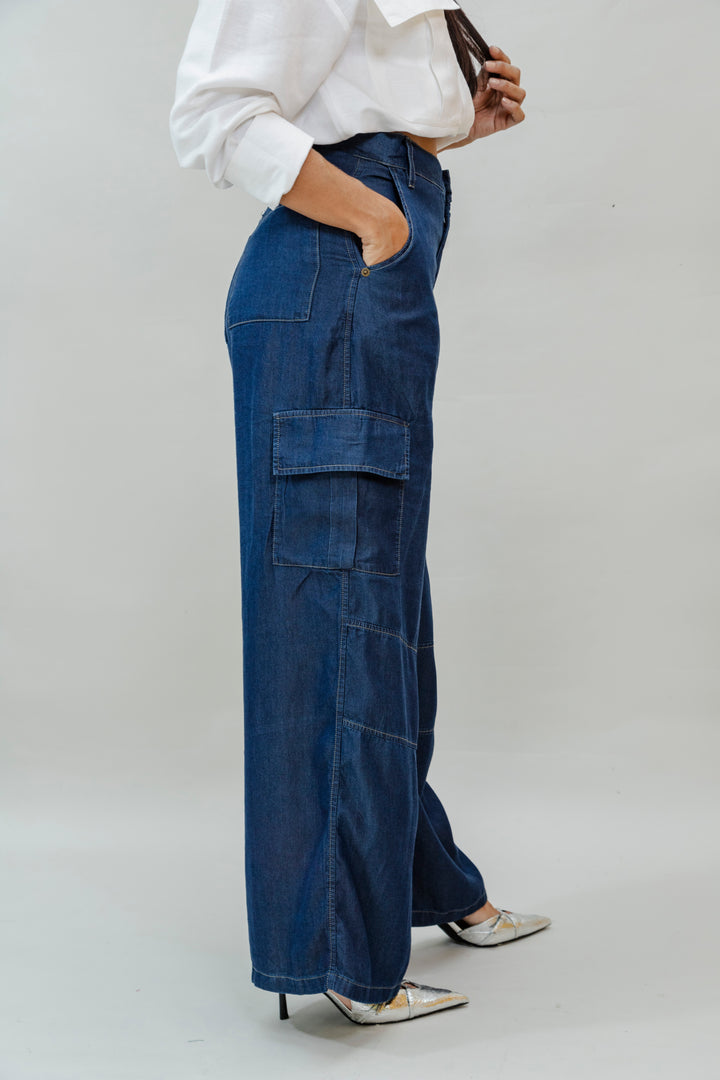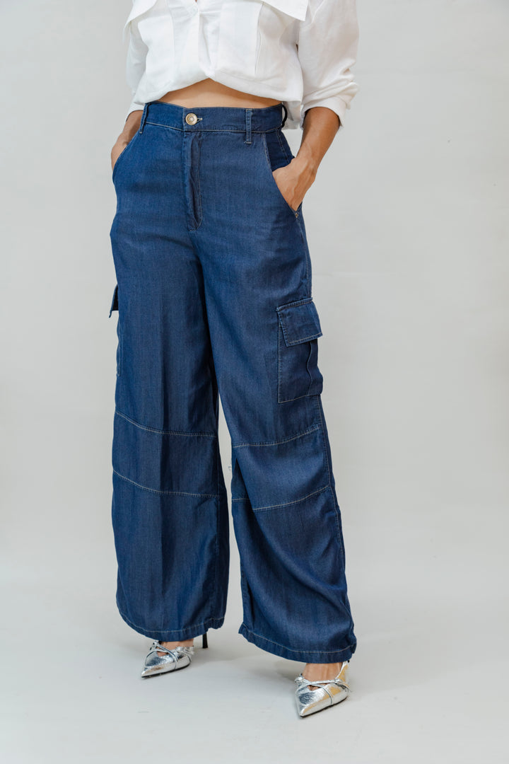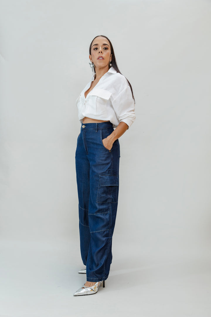 Este pantalón tipo cargo está confeccionado en suave y ligero tencel, una fibra ecológica que brinda una caída fluida y un tacto sedoso. Su diseño de bota ancha con costuras decorativas y bolsillos laterales tipo cargo le da un estilo urbano y moderno, ideal para looks casuales y sofisticados.