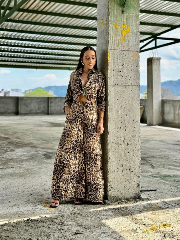 Pantalón de corte recto y cintura alta, confeccionado en 100% rayón, un tejido ligero y con caída fluida que aporta comodidad y frescura. Su estampado animal print le otorga un estilo audaz y sofisticado, ideal para looks versátiles. Cuenta con forro interno para mayor confort y mejor ajuste. Perfecto para combinar con blusas neutras o en conjunto con la camisa a juego para un outfit impactante.