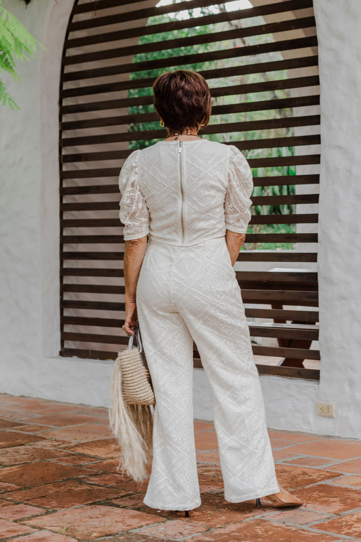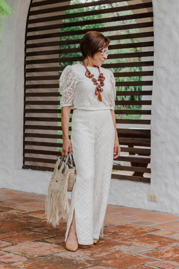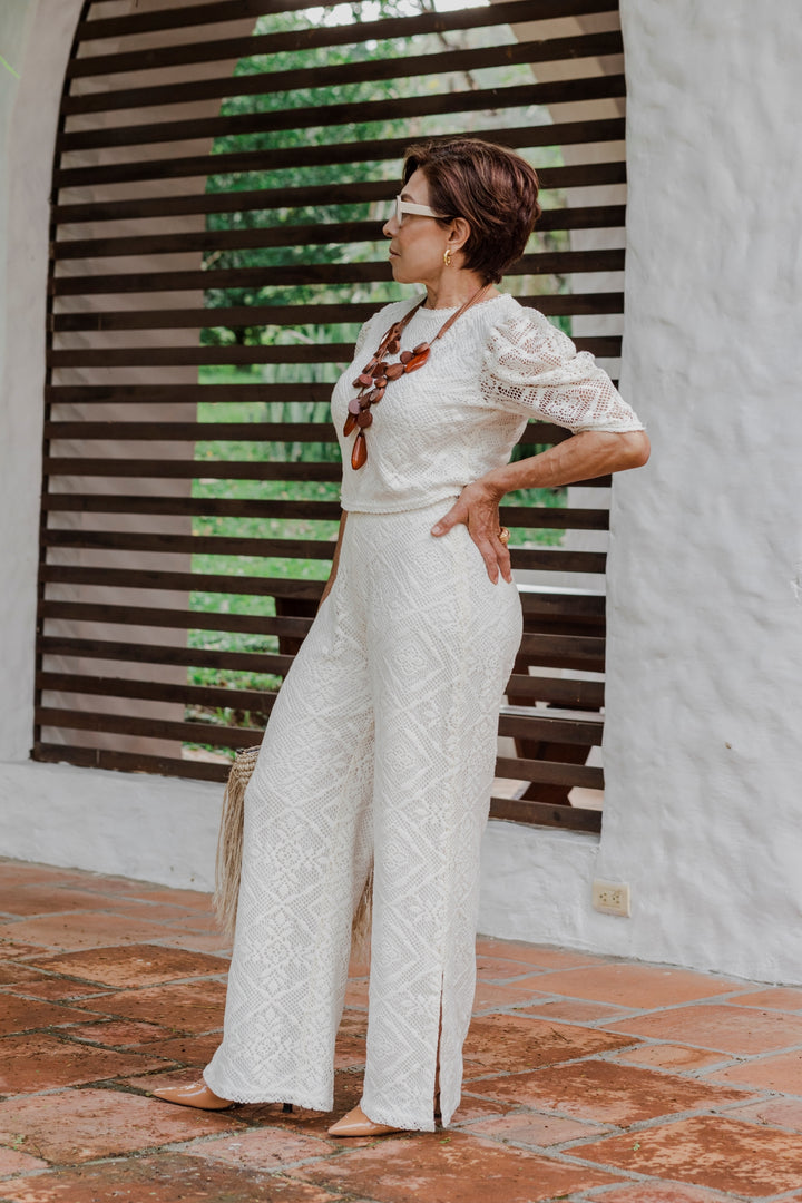 La blusa presenta un delicado diseño de encaje con mangas abullonadas, que aportan un aire romántico y femenino. El pantalón de tiro alto, con aberturas en los tobillos, estiliza la figura y brinda fluidez al movimiento.