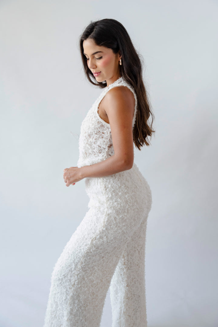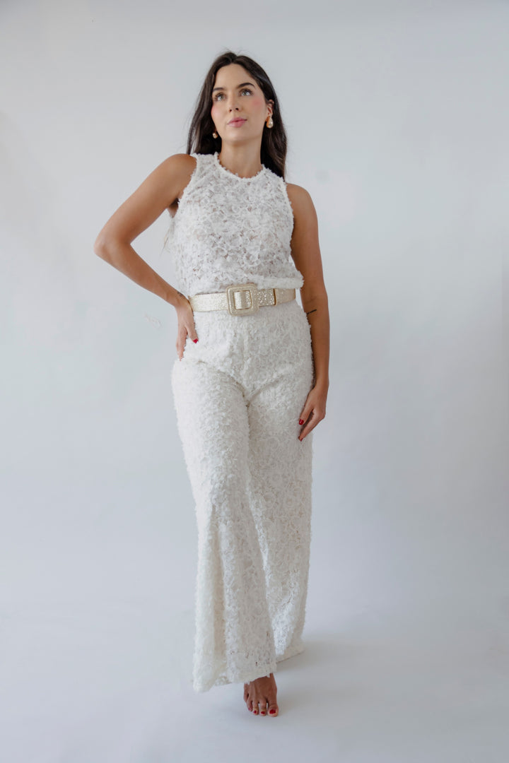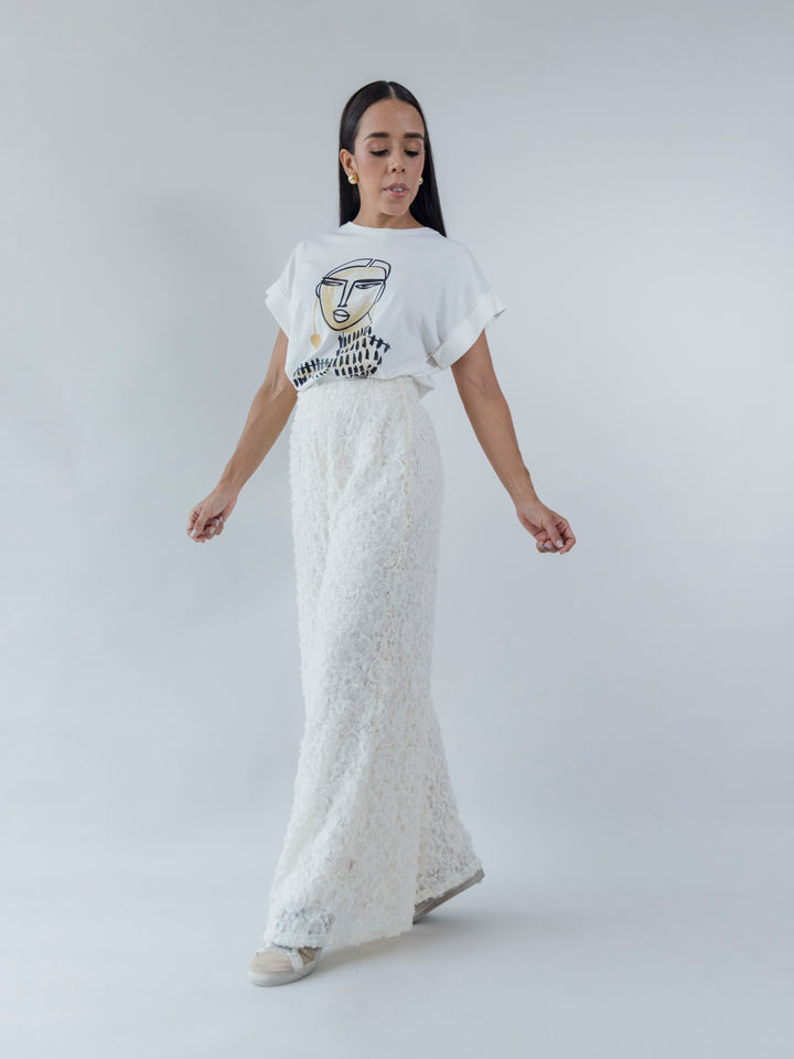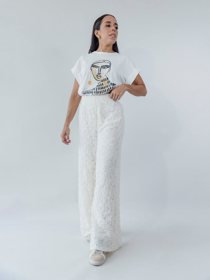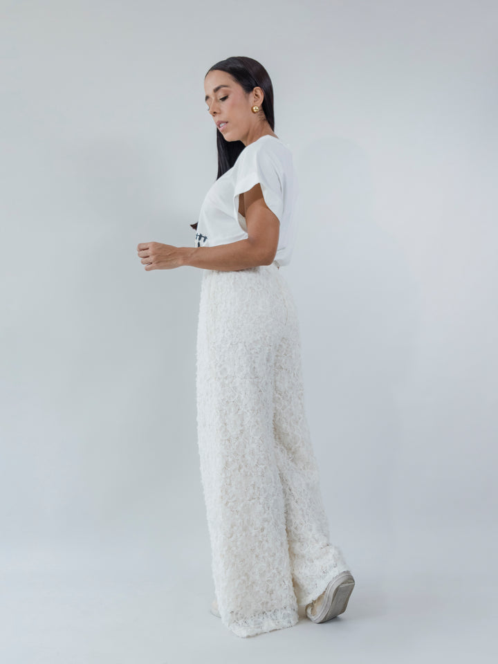 Este pantalón de tiro alto y corte amplio destaca por su textura única y su caída elegante. Su tejido con relieve añade un toque sofisticado y vanguardista, ideal para looks modernos y versátiles.