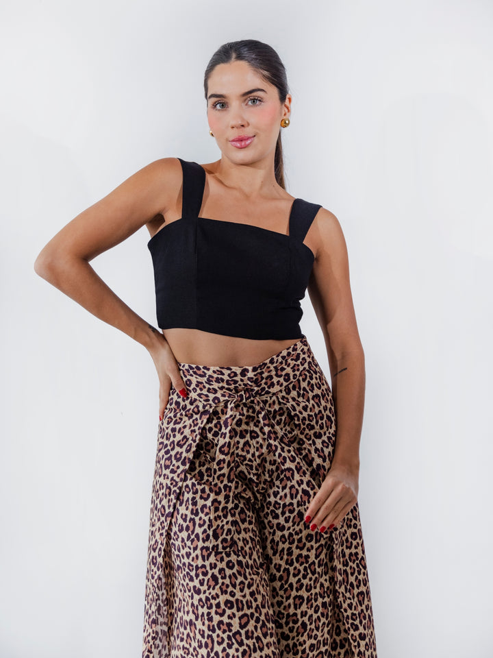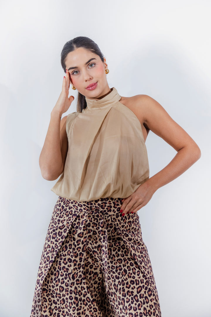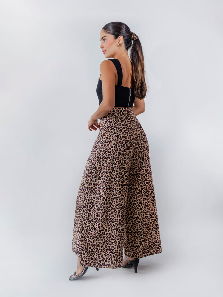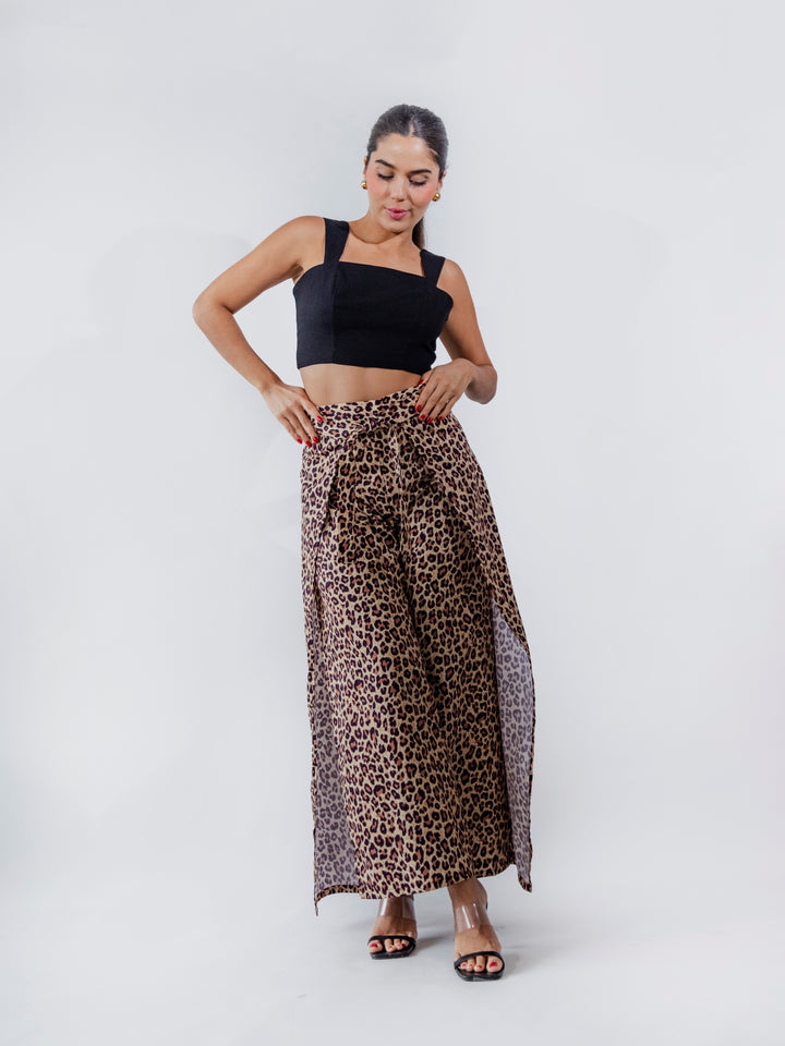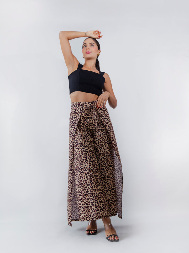 Pantalón tipo pareo confeccionado en 100% algodón, con un diseño envolvente que crea una silueta fluida y elegante. Su estampado animal print aporta un toque atrevido y sofisticado, mientras que la caída amplia y la abertura frontal brindan movimiento y frescura. Perfecto para un look versátil y moderno.
