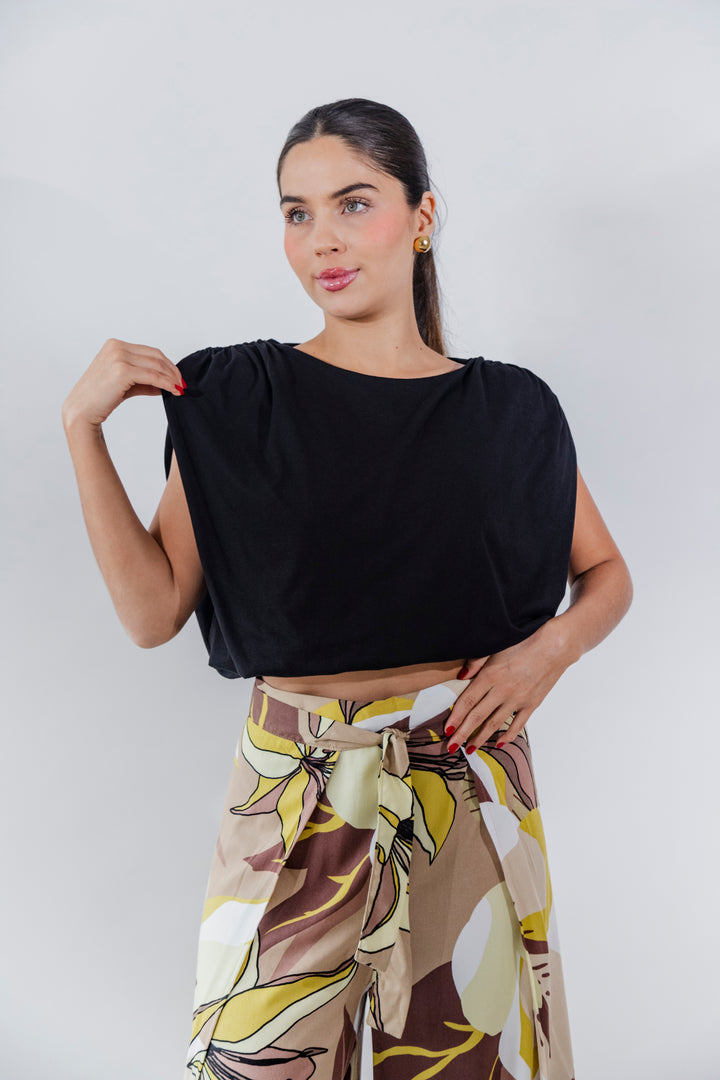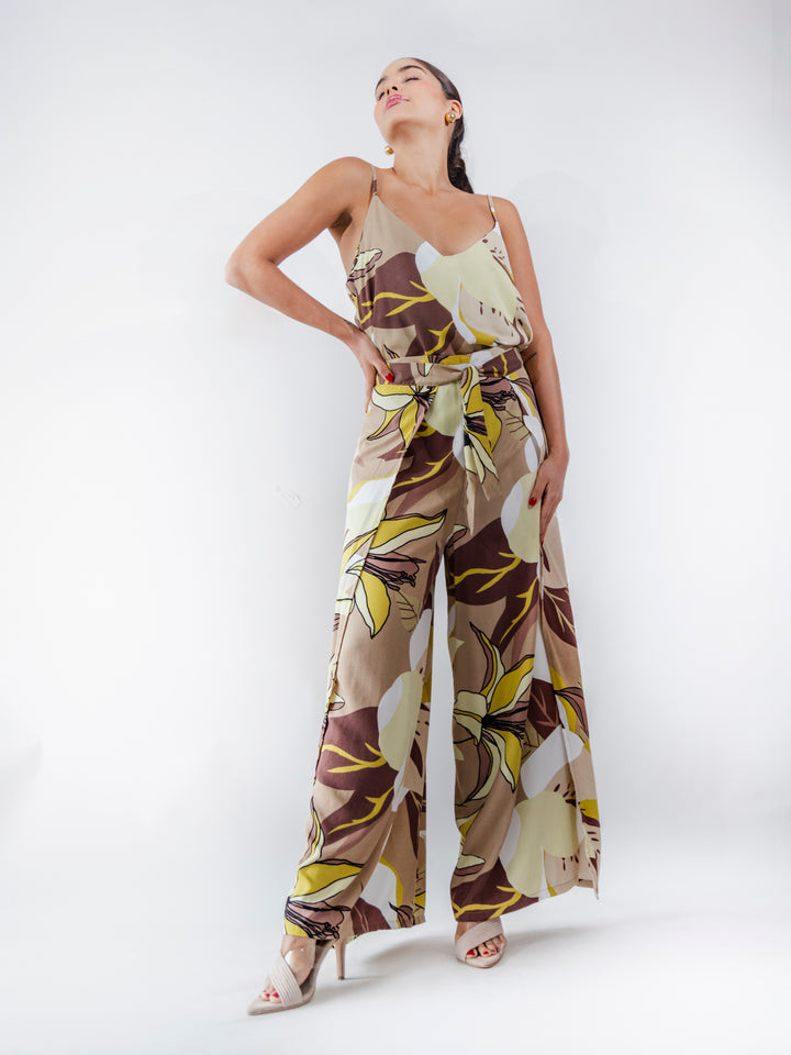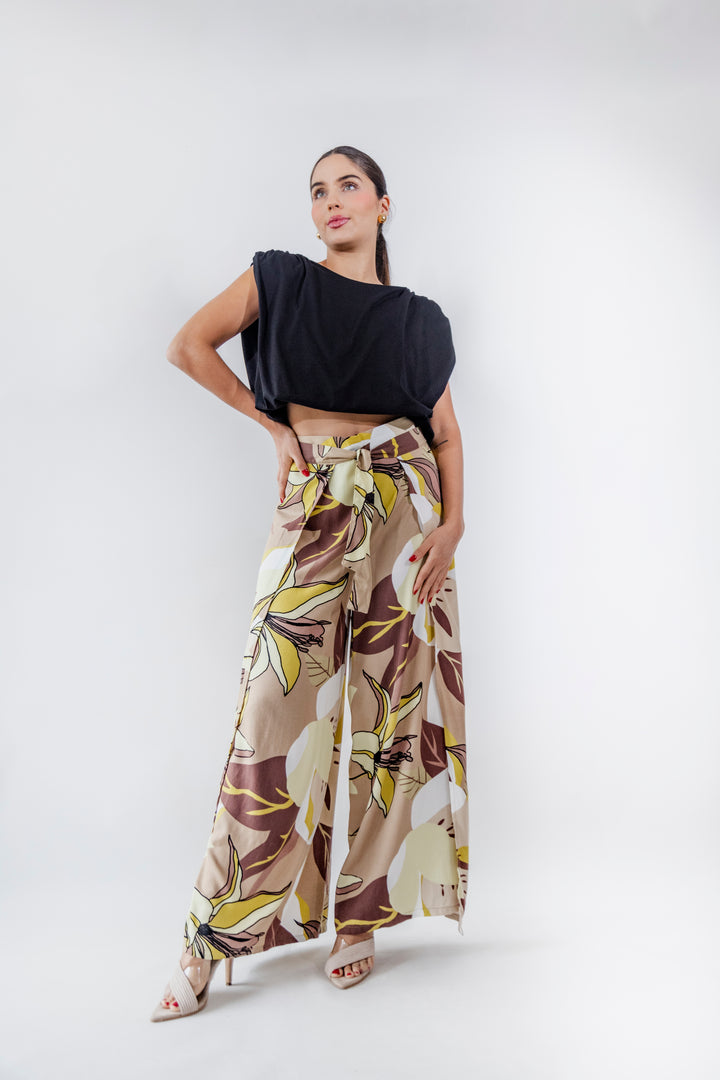 Este pantalón tipo pareo combina fluidez y sofisticación en un diseño envolvente que estiliza la silueta. Confeccionado en 100% rayón viscosa, ofrece una textura ligera y fresca, perfecta para la temporada.