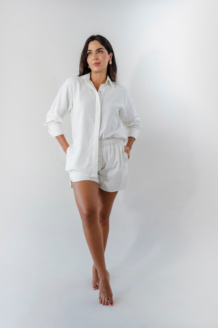 Short de tiro alto con pretina elástica para un ajuste cómodo. Su tela en mezcla de lino y rayón brinda frescura y suavidad, ideal para climas cálidos. Forrado en algodón para mayor confort y ligereza.