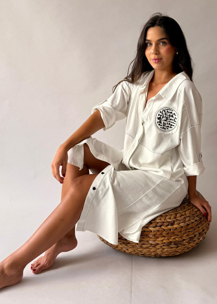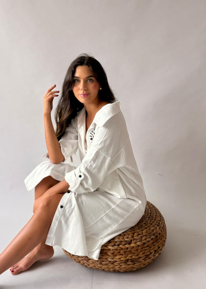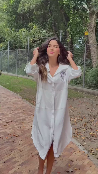 Su silueta fluida y de corte midi se complementa con un cierre de botones al frente, mangas con ajuste de botón y un detalle bordado en el pecho que aporta un toque distintivo y moderno.