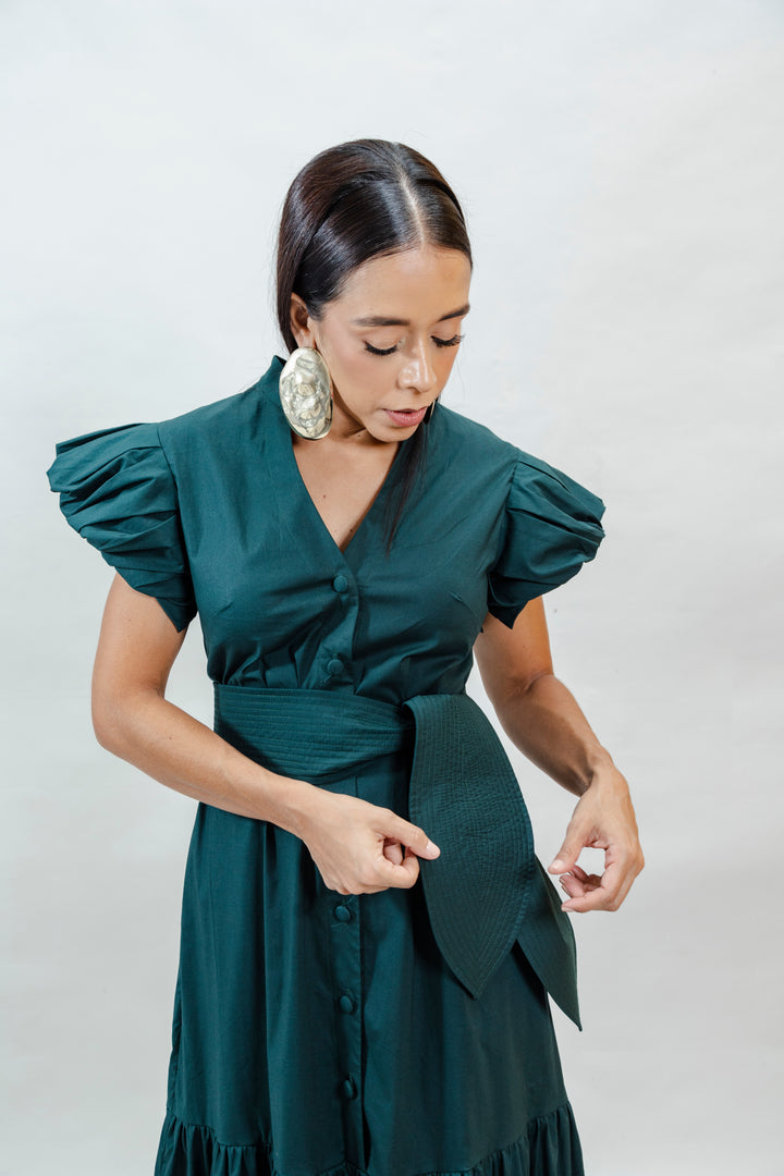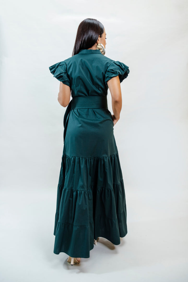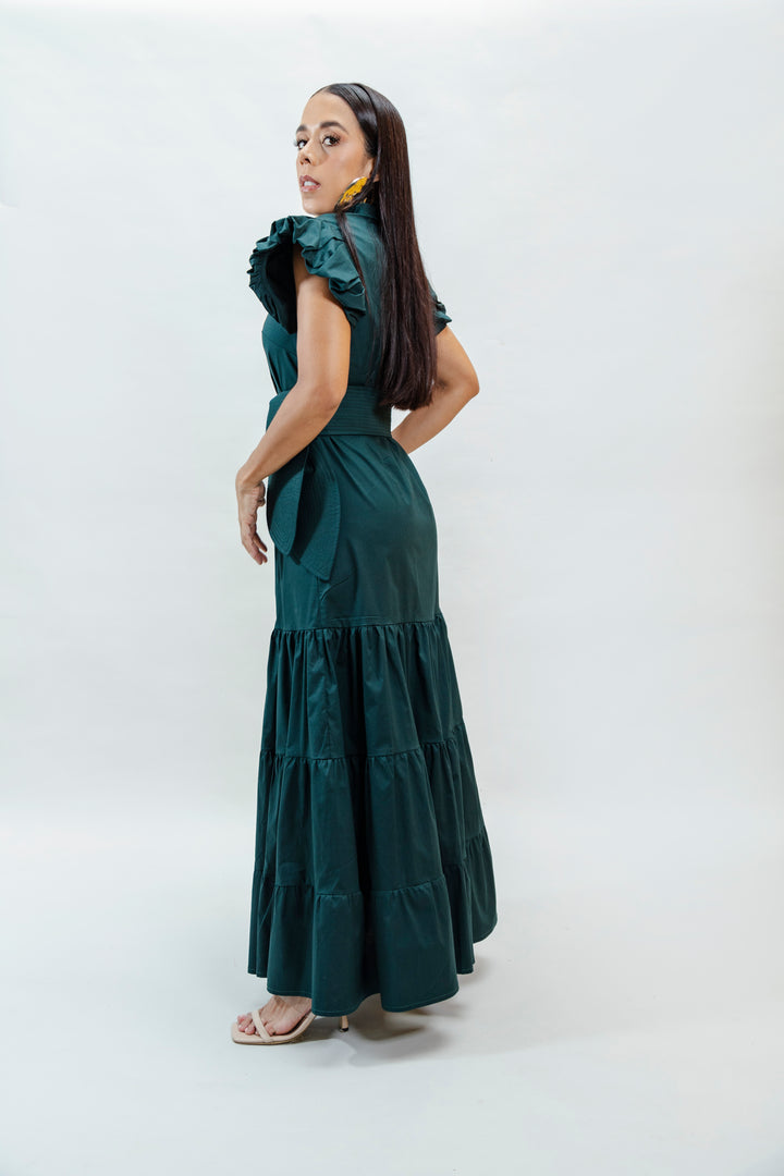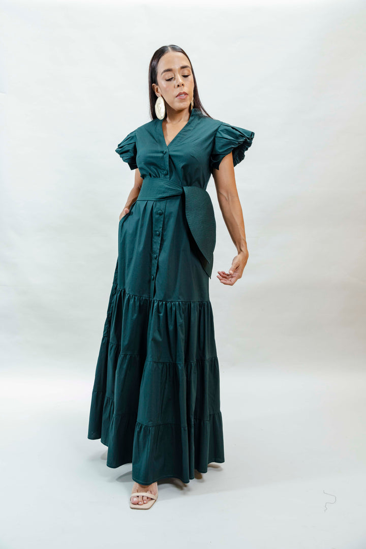 Un diseño que roba miradas. Este vestido largo en 98% algodón verde es fresco, ligero y con un toque elástico gracias a su 2% de spandex, lo que brinda mayor confort sin sacrificar estructura. Sus mangas con volantes, botonadura frontal y falda en capas crean una silueta femenina con movimiento. El gran lazo en la cintura le da un aire sofisticado y audaz, ideal para ocasiones especiales o para elevar un look de día.