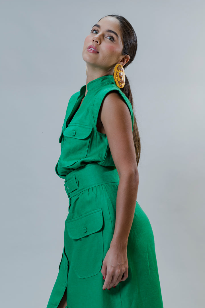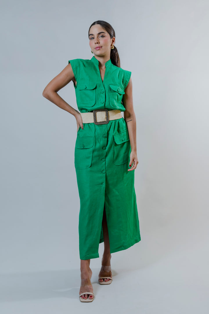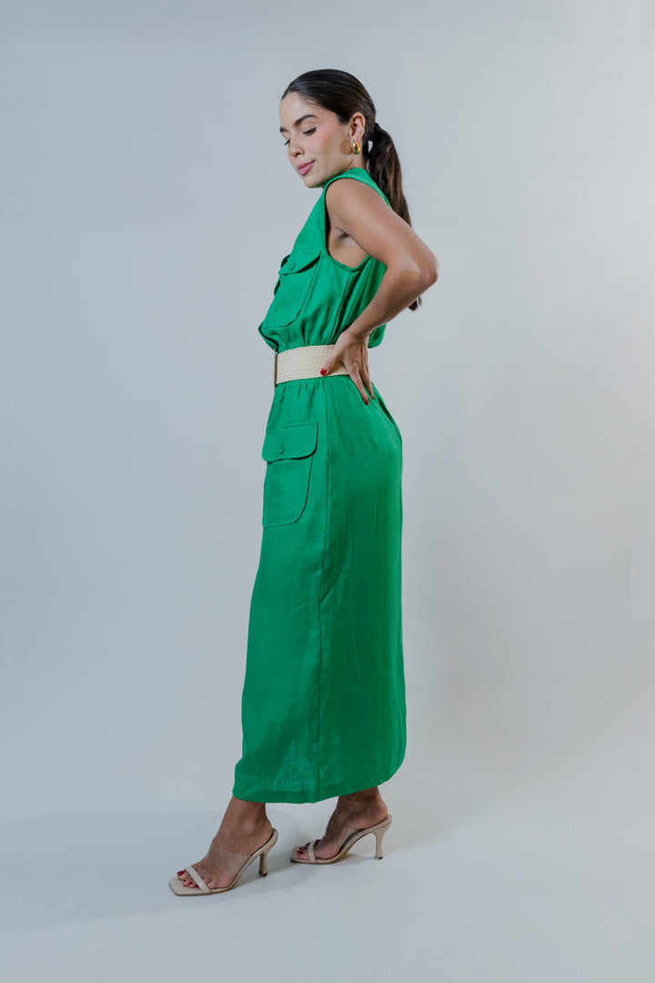 Este vestido de lino 100% con forro es la combinación perfecta entre elegancia y funcionalidad. Su diseño sin mangas y su silueta estructurada lo hacen una pieza sofisticada y versátil. Incorpora detalles utilitarios como bolsillos con solapa y un cinturón que define la cintura, aportando un toque refinado y favorecedor.
