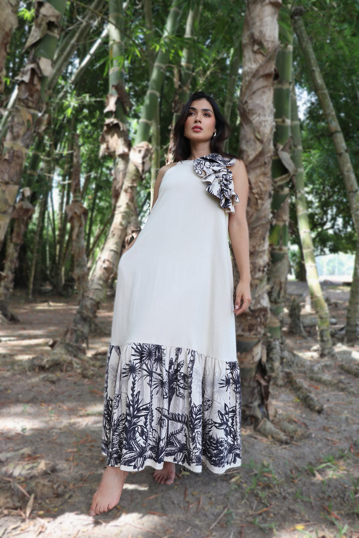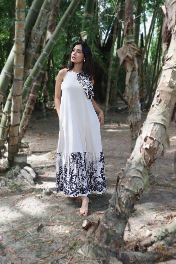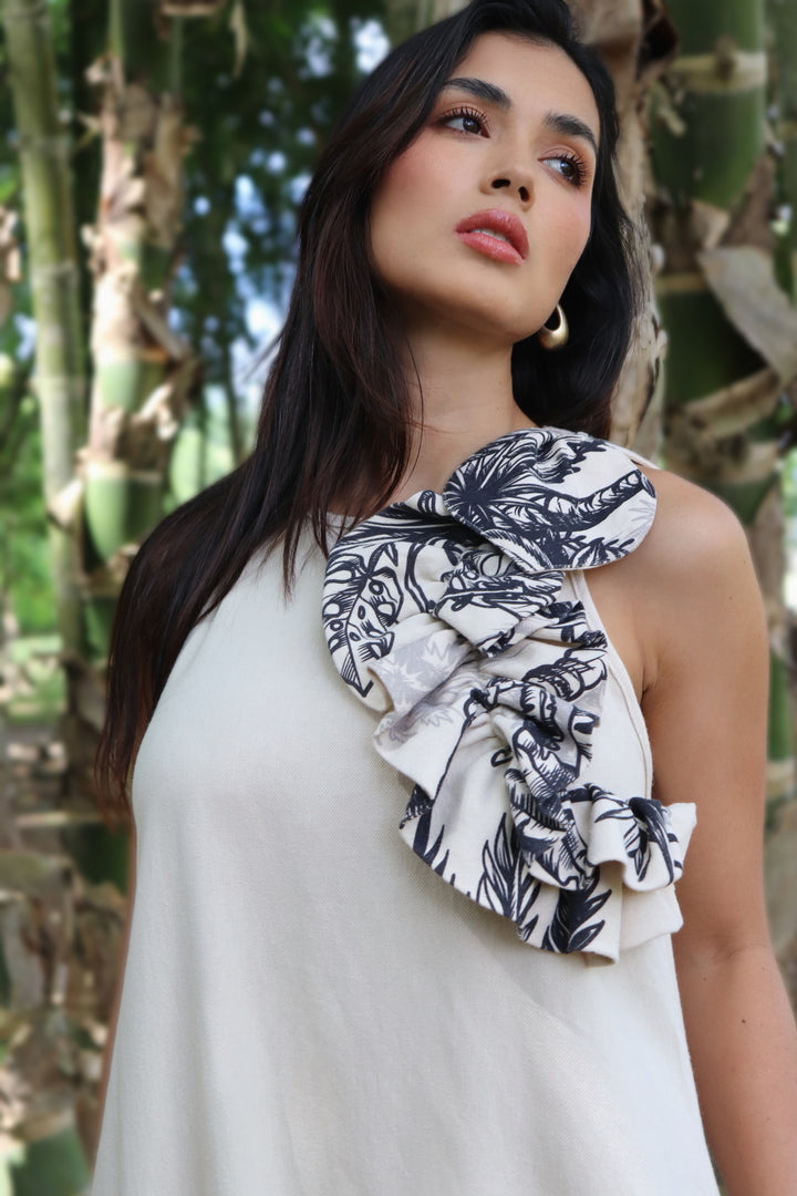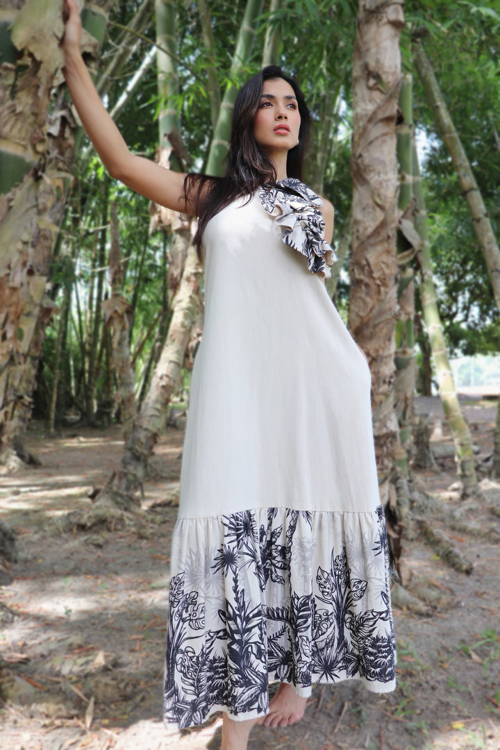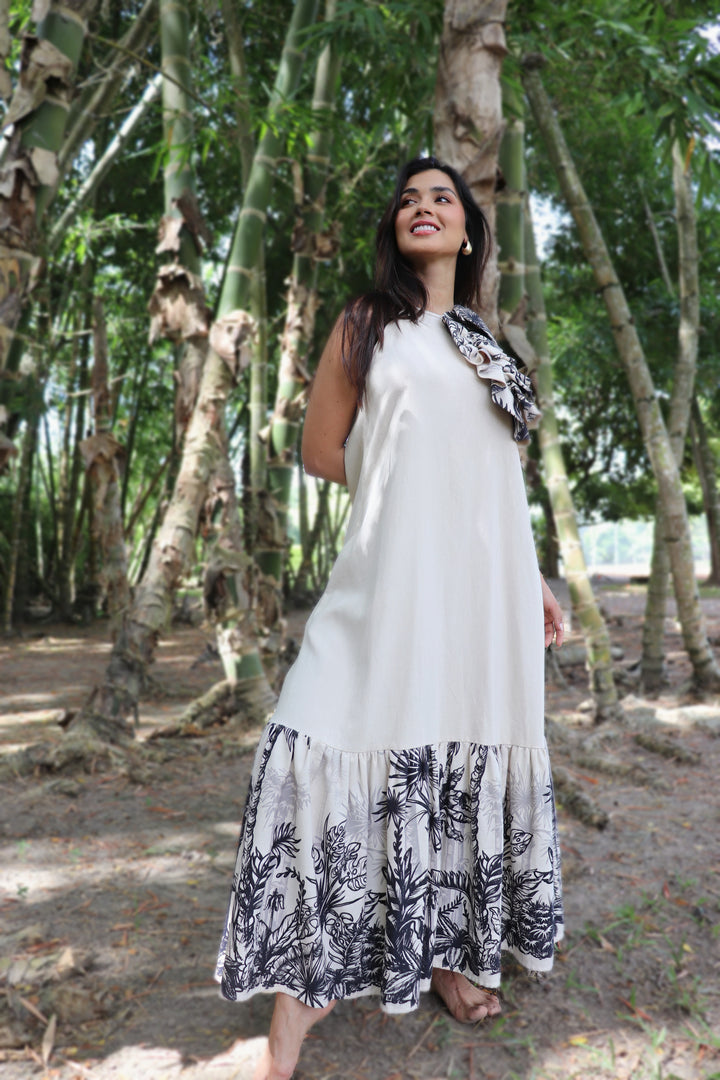 Diseñado en lino puro, este vestido une frescura natural con elegancia artesanal. Su silueta amplia y fluida brinda libertad de movimiento, mientras que el detalle de volantes en el escote y el estampado en el ruedo aportan un toque distintivo y femenino. Perfecto para los días cálidos donde la comodidad y el estilo van de la mano.