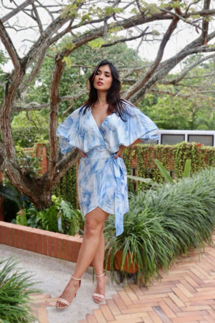 Ligero, delicado y con movimiento natural, este vestido está confeccionado en rayón viscosa, una tela ideal para climas cálidos gracias a su frescura y suavidad al tacto. Su diseño cruzado con amarre lateral realza la figura de manera sutil, mientras que el estampado en tonos azul acuarela le aporta un aire romántico y femenino. Perfecto para días soleados, paseos al aire libre o momentos especiales donde quieras sentirte cómoda y estilizada.