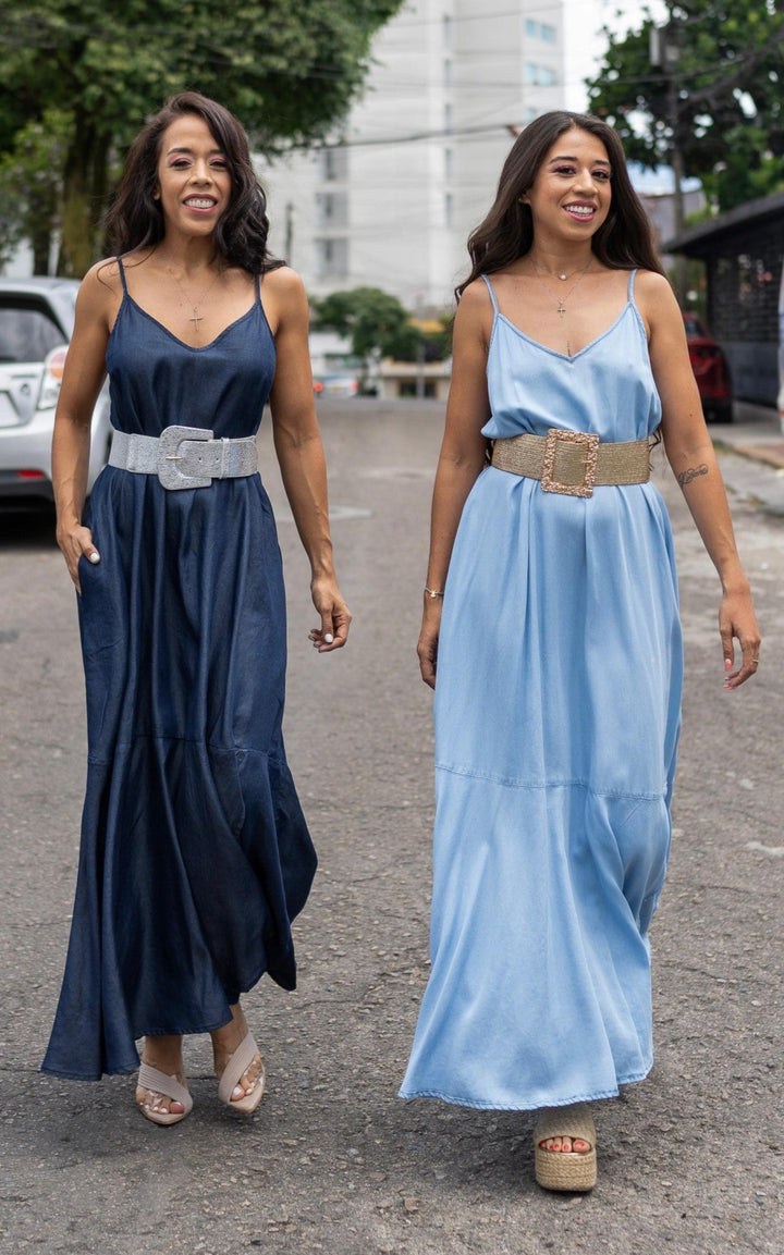 Vestido largo en 100% Tencel, un tejido suave, liviano y con una caída fluida que aporta movimiento natural a cada paso. Su diseño de tiras delgadas y escote en “V” crea una silueta delicada y femenina, mientras que el corte amplio ofrece comodidad sin perder elegancia. El detalle del cinturón ancho realza la cintura y equilibra la figura, haciendo de esta pieza una opción ideal para un look fresco, sofisticado y versátil.