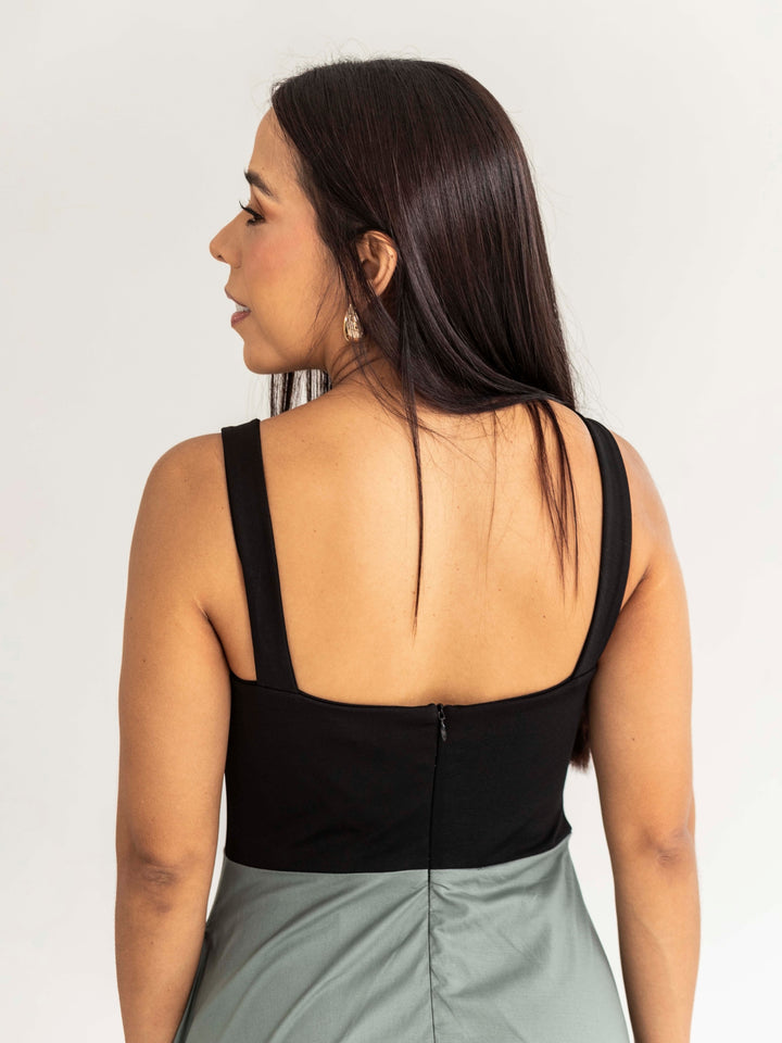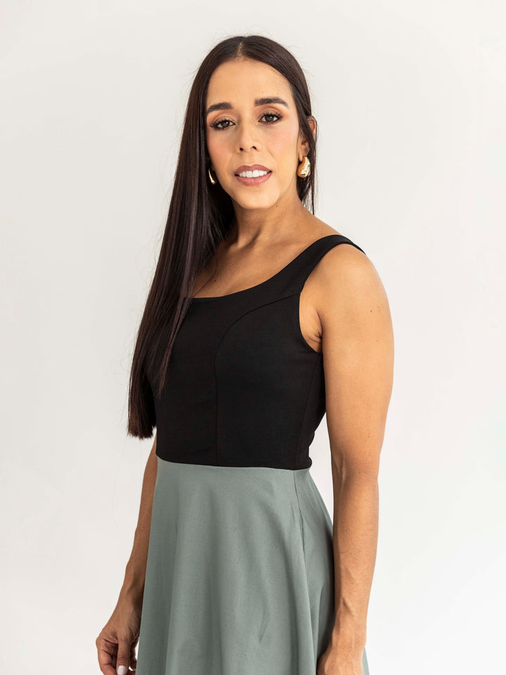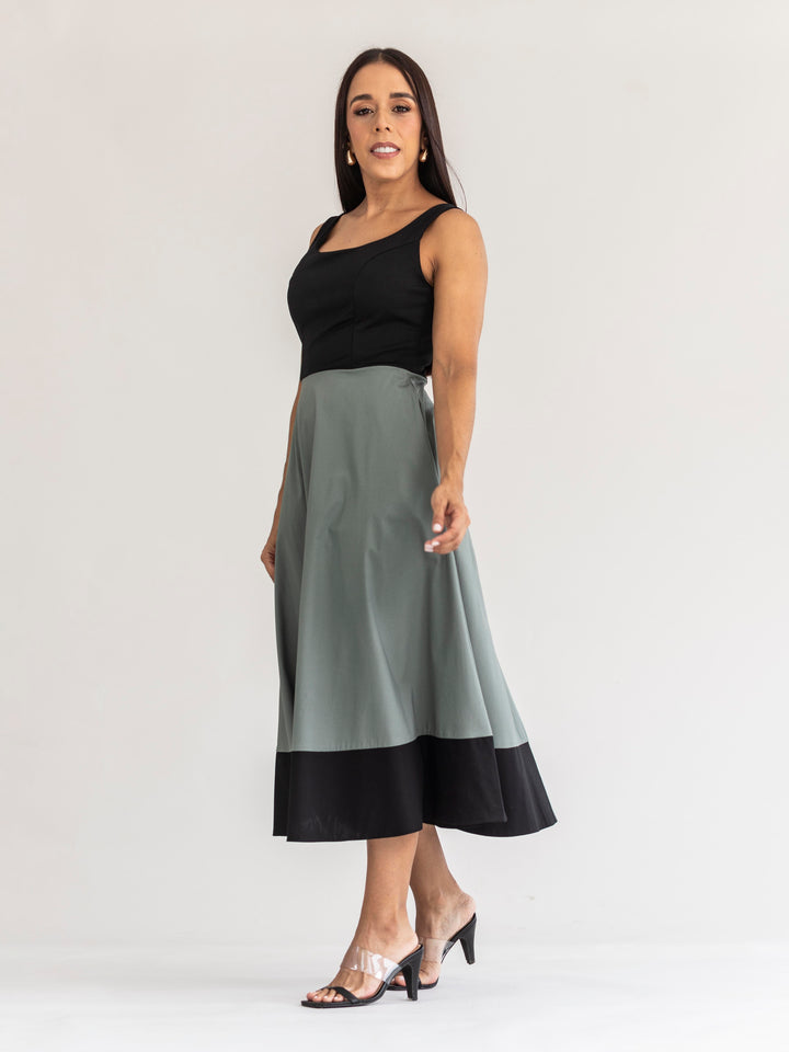 Vestido midi bicolor en algodón 98% con spandex 2%, con escote cuadrado y silueta ajustada en la parte superior que realza el torso, y falda en línea A que brinda movimiento y sofisticación. El contraste entre el negro y el tono nude aporta un equilibrio elegante y minimalista, ideal para ocasiones especiales, reuniones o días en los que quieres destacar con estilo sutil. El spandex añade confort y libertad de movimiento sin perder estructura.
