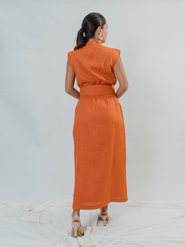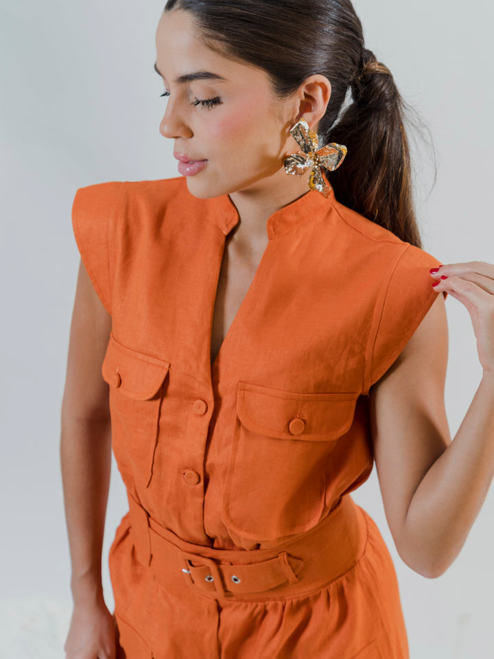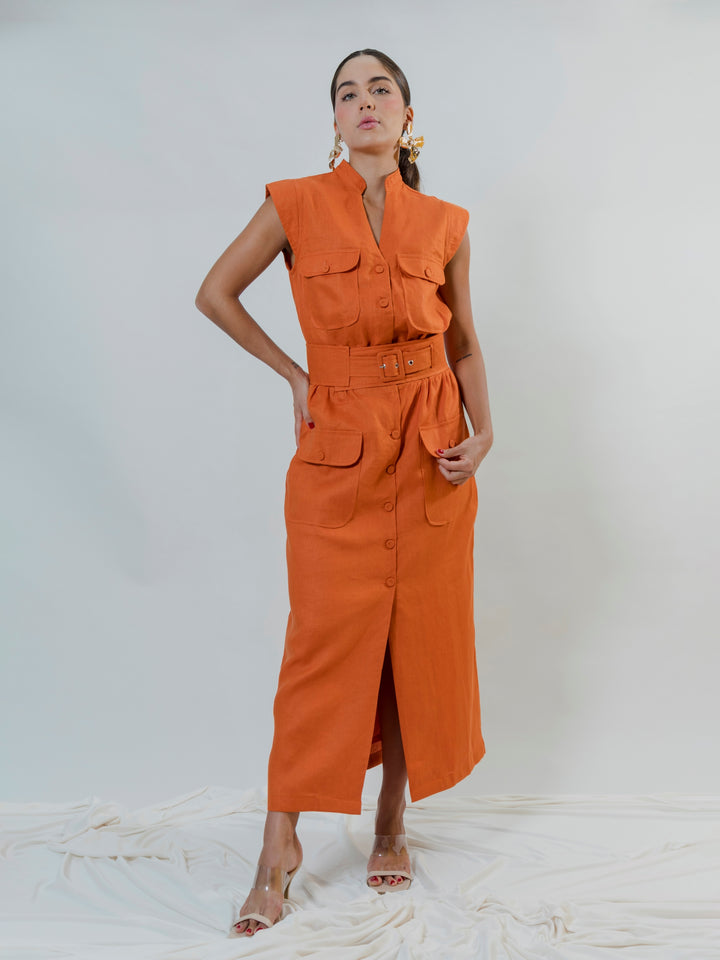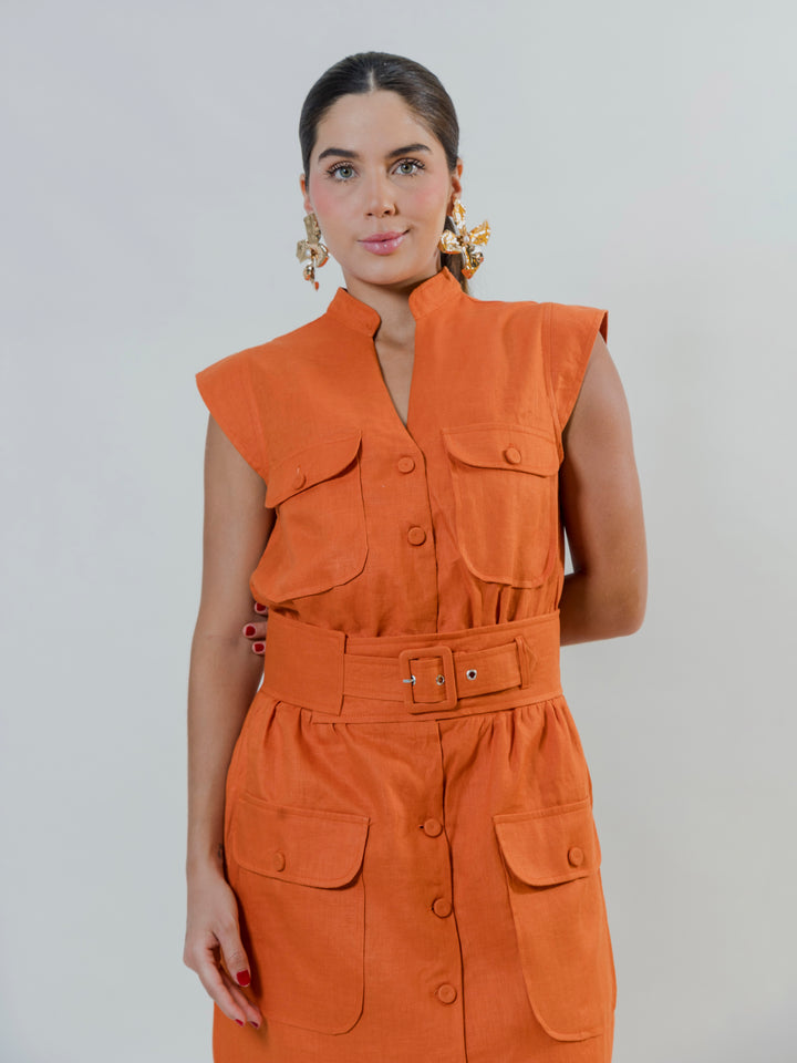 Este vestido de lino 100% con forro es la combinación perfecta entre elegancia y funcionalidad. Su diseño sin mangas y su silueta estructurada lo hacen una pieza sofisticada y versátil. Incorpora detalles utilitarios como bolsillos con solapa y un cinturón que define la cintura, aportando un toque refinado y favorecedor.