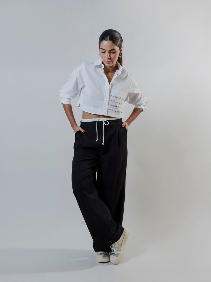 Su pretina elástica con amarre ajustable garantiza comodidad durante todo el día, mientras que el corte tipo palazzo estiliza la figura sin sacrificar frescura.